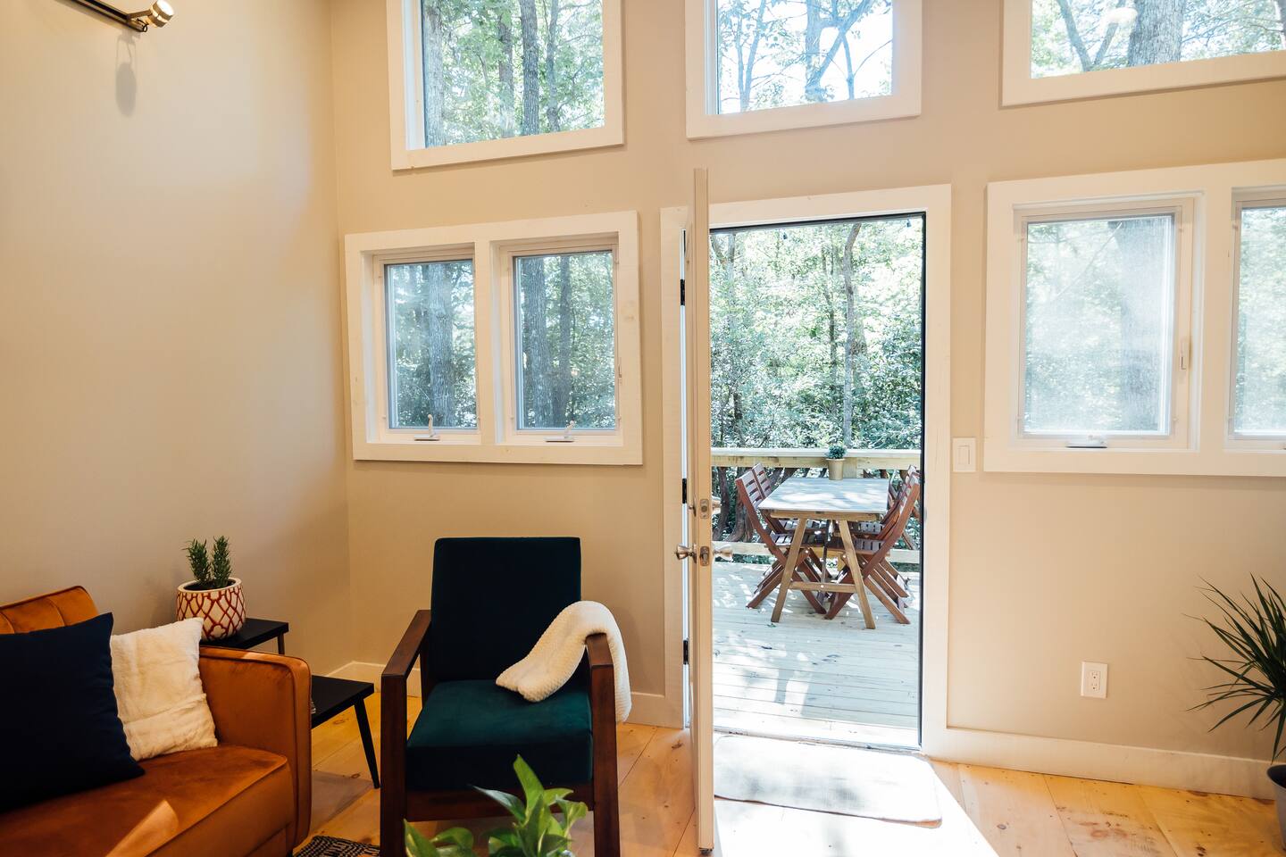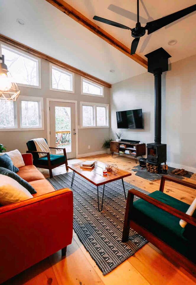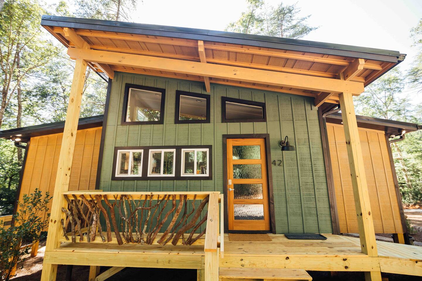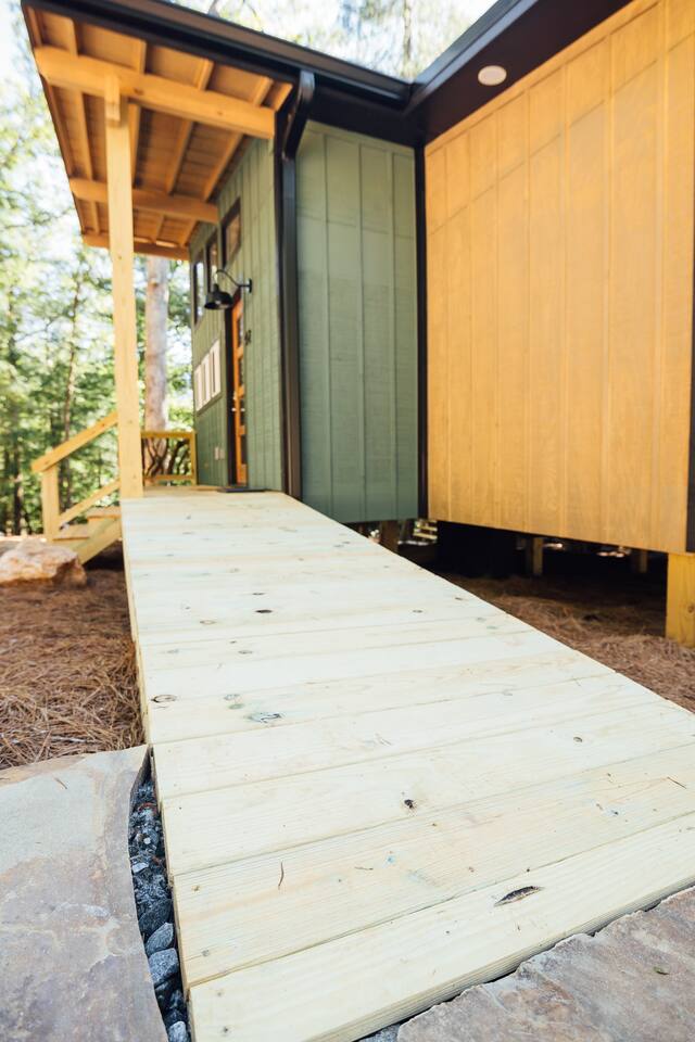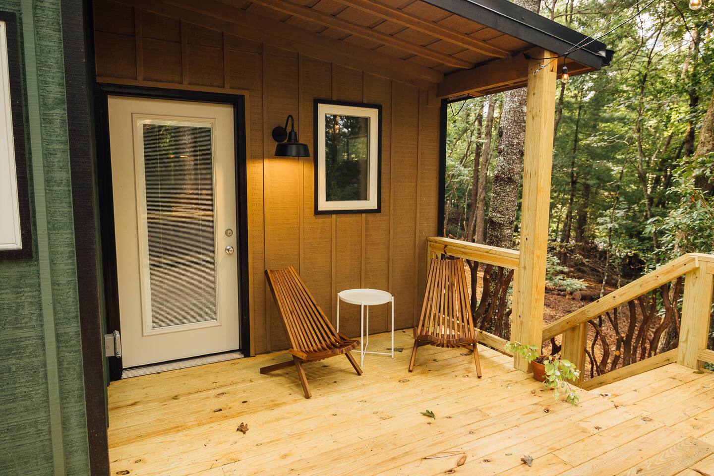 “Beautiful...comfortable...close to everything...spotless...perfect...peaceful” This is what recent guests have to say about their experience at Trahlyta. This new two-bedroom and two-bath modern cabin sits on 6 wooded acres just 10 minutes from town. The cabin is located at the end of a short paved driveway with easy access and plenty of parking. We are pet friendly and would love to host you and your pets during your trip to Dahlonega! Trahlyta Cabin was universally designed so that people of all abilities could have a beautiful, comfortable, and thoughtfully-designed space in which to experience the joy of travel. There is a ramp for wheelchair/limited mobility access. All interior doors are 36” wide. All appliances are ADA-compliant. All sinks are wheel-under. The kitchen table is wheel-under height as well. All doors have lever handles. The ADA bathroom is equipped with grab bars, a roll-in shower with a bench, and a handheld showerhead. Each bedroom features a queen-sized bed, its own mini-split AC/heat unit, and an en suite bathroom. Bathroom 1 features a wheelchair-accessible roll-in shower and grab bars in the shower and at the toilet. Bathroom 2 features a soaking tub and rainfall shower head and TUSHY bidet. Cause you're fancy like that. The living room is cozy, with a couch, chairs, a wood-burning stove, a TV with Roku, board games, a sound bar with Bluetooth connectivity, and even coloring books for the kids! Speaking of kiddos, we are happy to supply a pack-n-play and some toys/books - please let us know if you would like this accommodation. Dahlonega has some of the best dining in North Georgia, but sometimes you want something home-cooked. Cook a meal in our fully-stocked kitchen and gather around our dining table for four or take some plates outside to the patio dining set. The kitchen features stainless steel appliances and granite countertops, with complimentary 8-o'clock coffee and various tea offered to guests. We have a French press and a Keurig coffee maker. We have reusable K-cups or feel free to bring your own. Also, the fridge makes craft ice balls - perfect for an after-dinner cocktail. We have a charcoal grill located on the back deck- bring some charcoal and have a cookout! After a day of adventures, relax on the back deck which feels more like a tree fort, or around the fire pit. Enjoy the brand new outdoor tv area! Explore the woods! You might see some wildlife! You'll probably see Mama Deer and her fawn. We've also seen chipmunks, hawks, squirrels, and some guests are lucky enough to have seen black bears. Relax in the hammock on the back deck, but do so at your own risk! Whatever brings you to Dahlonega, we hope to provide you with a luxurious and comfortable experience at Trahlyta. **Cleaned and sanitized after each guest using CDC-recommended guidelines. We are committed to offering you a clean, safe place to vacation with friends or family.** Early check-in may be available for an additional fee of $35. STR License 4595