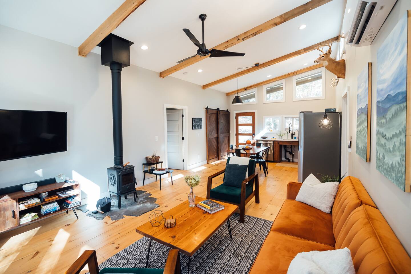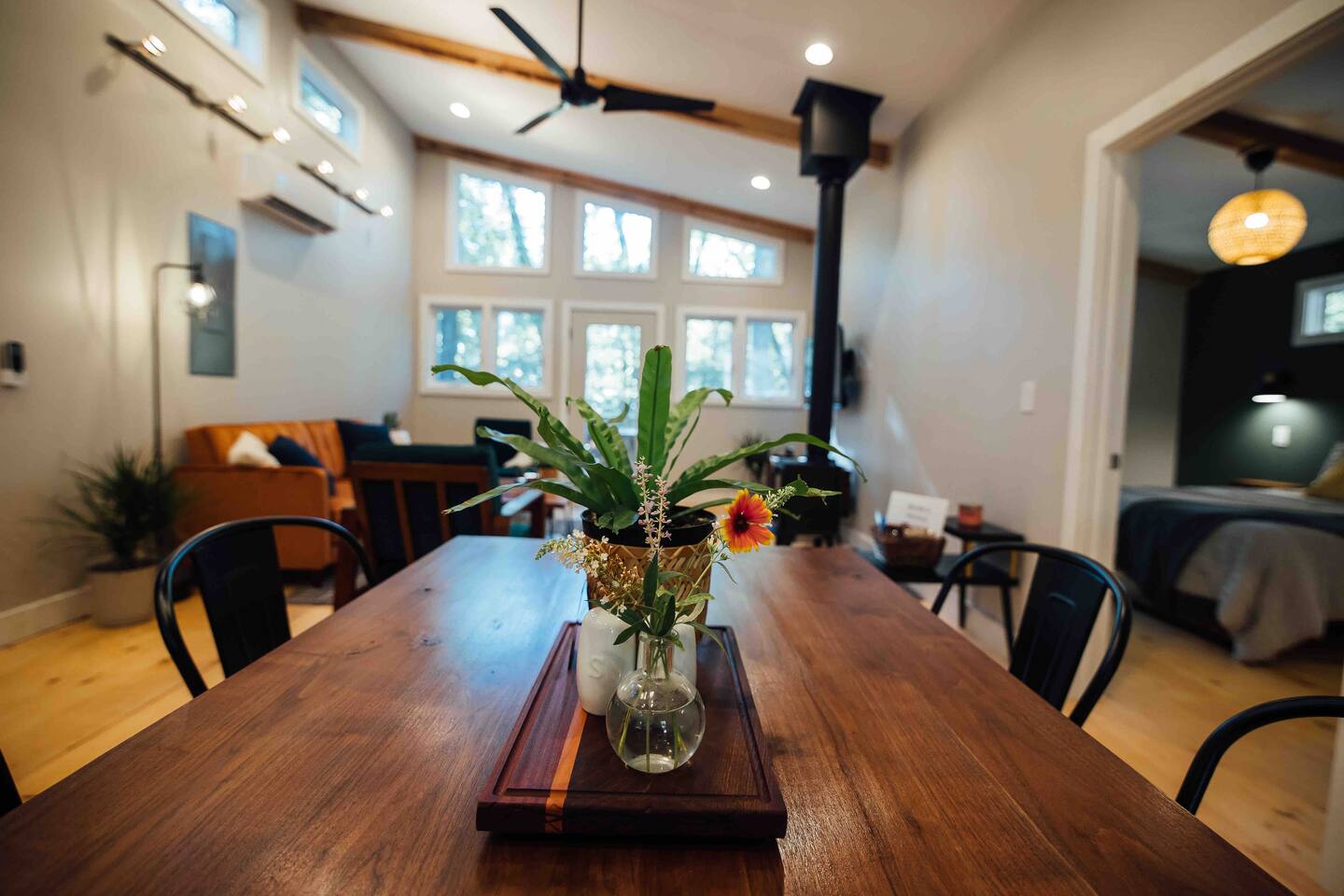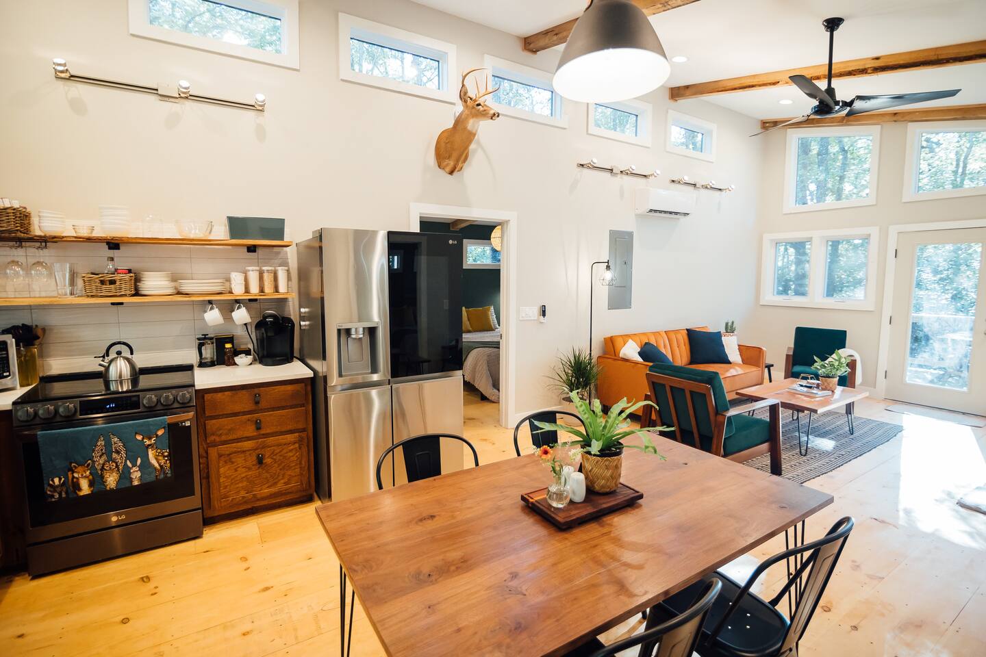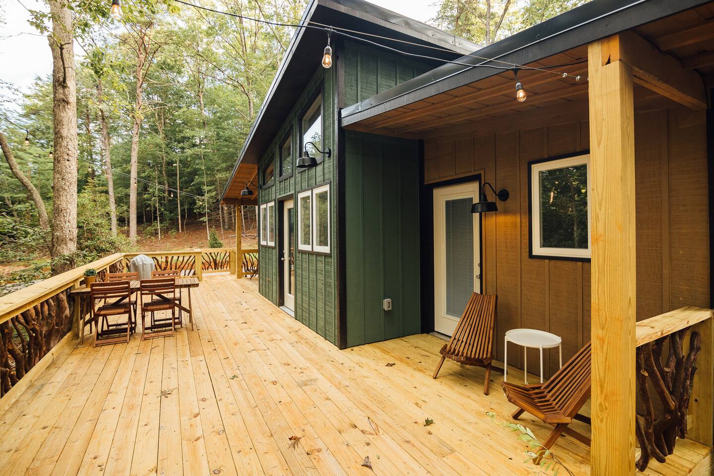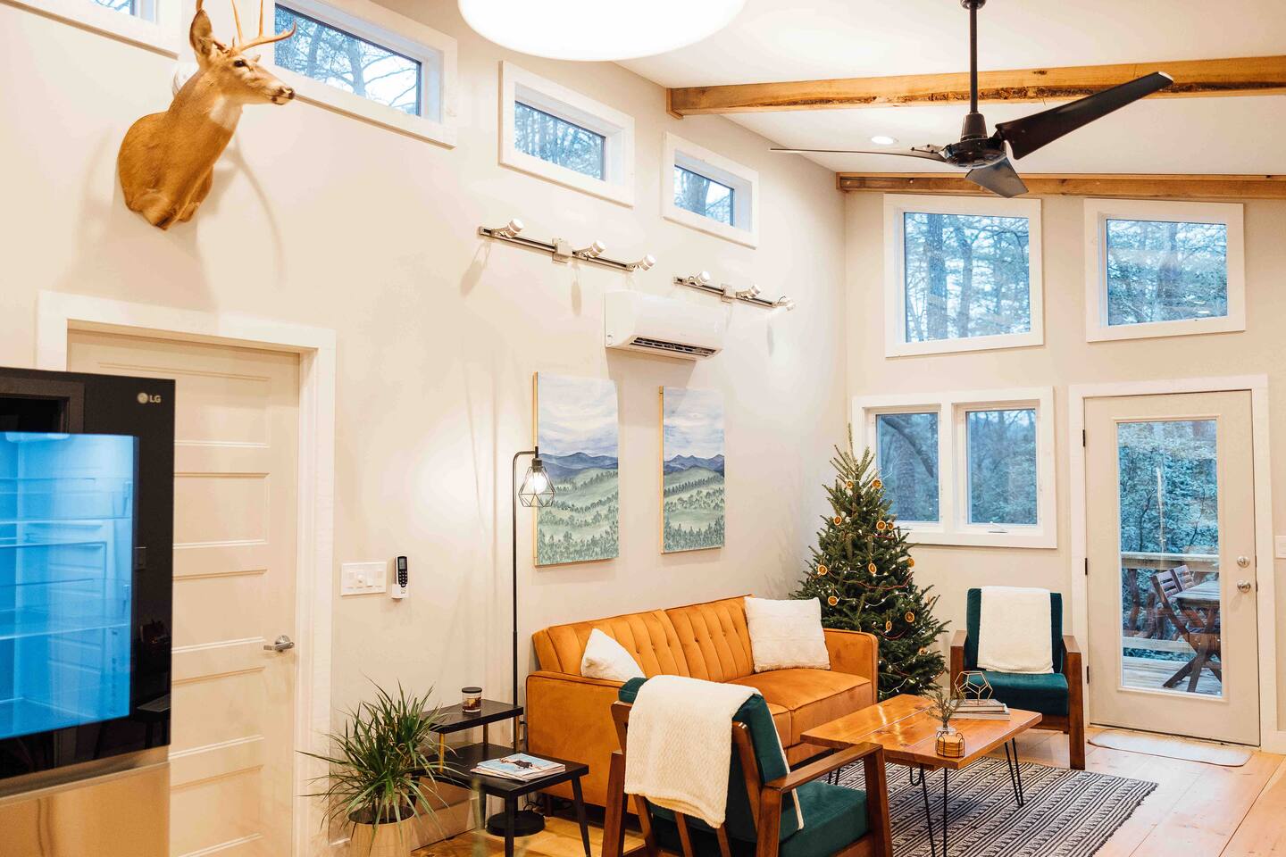 “Beautiful...comfortable...close to everything...spotless...perfect...peaceful” This is what recent guests have to say about their experience at Trahlyta. This new two-bedroom and two-bath modern cabin sits on 6 wooded acres just 10 minutes from town. The cabin is located at the end of a short paved driveway with easy access and plenty of parking. We are pet friendly and would love to host you and your pets during your trip to Dahlonega! Trahlyta Cabin was universally designed so that people of all abilities could have a beautiful, comfortable, and thoughtfully-designed space in which to experience the joy of travel. There is a ramp for wheelchair/limited mobility access. All interior doors are 36” wide. All appliances are ADA-compliant. All sinks are wheel-under. The kitchen table is wheel-under height as well. All doors have lever handles. The ADA bathroom is equipped with grab bars, a roll-in shower with a bench, and a handheld showerhead. Each bedroom features a queen-sized bed, its own mini-split AC/heat unit, and an en suite bathroom. Bathroom 1 features a wheelchair-accessible roll-in shower and grab bars in the shower and at the toilet. Bathroom 2 features a soaking tub and rainfall shower head and TUSHY bidet. Cause you're fancy like that. The living room is cozy, with a couch, chairs, a wood-burning stove, a TV with Roku, board games, a sound bar with Bluetooth connectivity, and even coloring books for the kids! Speaking of kiddos, we are happy to supply a pack-n-play and some toys/books - please let us know if you would like this accommodation. Dahlonega has some of the best dining in North Georgia, but sometimes you want something home-cooked. Cook a meal in our fully-stocked kitchen and gather around our dining table for four or take some plates outside to the patio dining set. The kitchen features stainless steel appliances and granite countertops, with complimentary 8-o'clock coffee and various tea offered to guests. We have a French press and a Keurig coffee maker. We have reusable K-cups or feel free to bring your own. Also, the fridge makes craft ice balls - perfect for an after-dinner cocktail. We have a charcoal grill located on the back deck- bring some charcoal and have a cookout! After a day of adventures, relax on the back deck which feels more like a tree fort, or around the fire pit. Enjoy the brand new outdoor tv area! Explore the woods! You might see some wildlife! You'll probably see Mama Deer and her fawn. We've also seen chipmunks, hawks, squirrels, and some guests are lucky enough to have seen black bears. Relax in the hammock on the back deck, but do so at your own risk! Whatever brings you to Dahlonega, we hope to provide you with a luxurious and comfortable experience at Trahlyta. **Cleaned and sanitized after each guest using CDC-recommended guidelines. We are committed to offering you a clean, safe place to vacation with friends or family.** Early check-in may be available for an additional fee of $35. STR License 4595