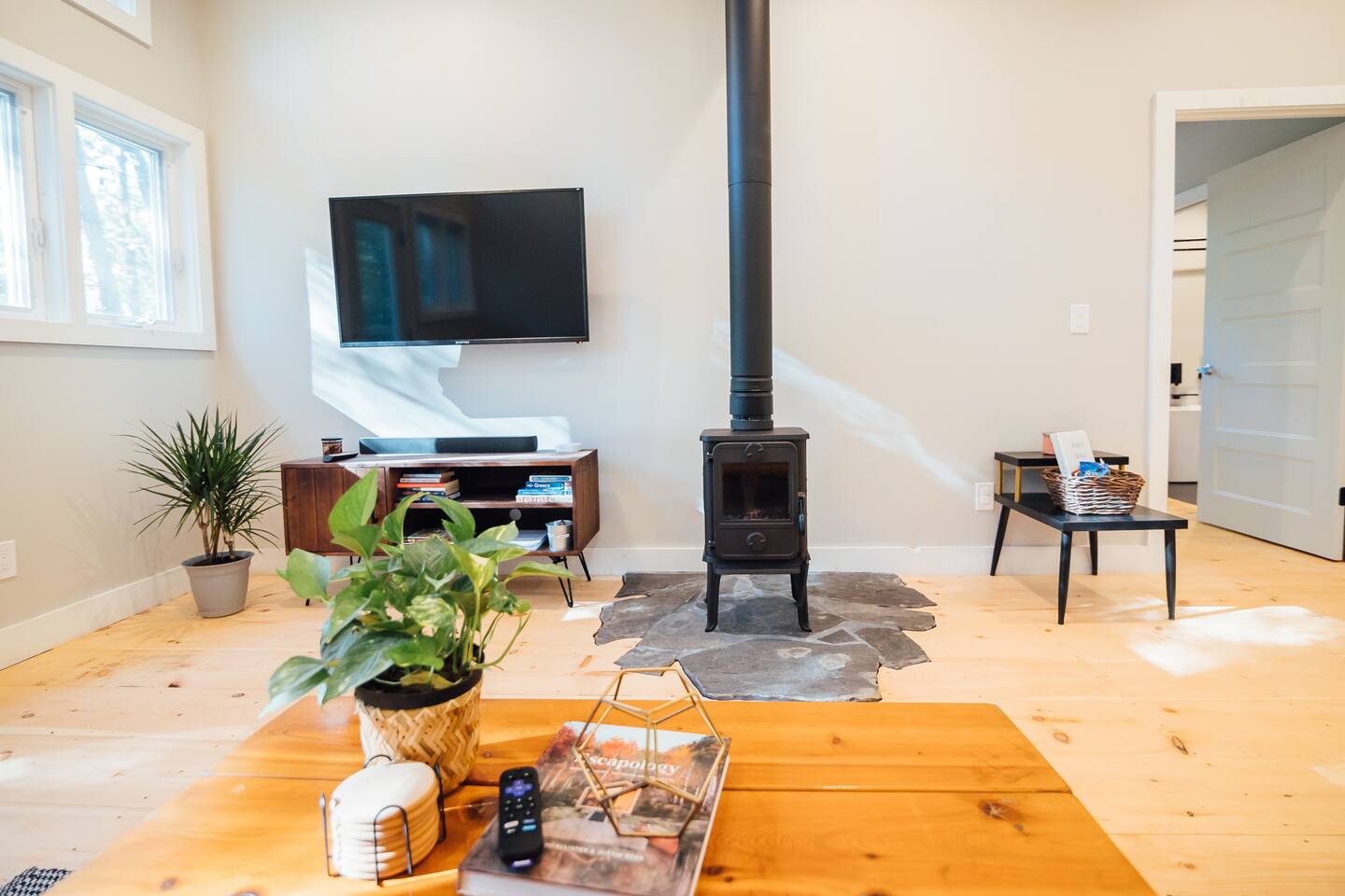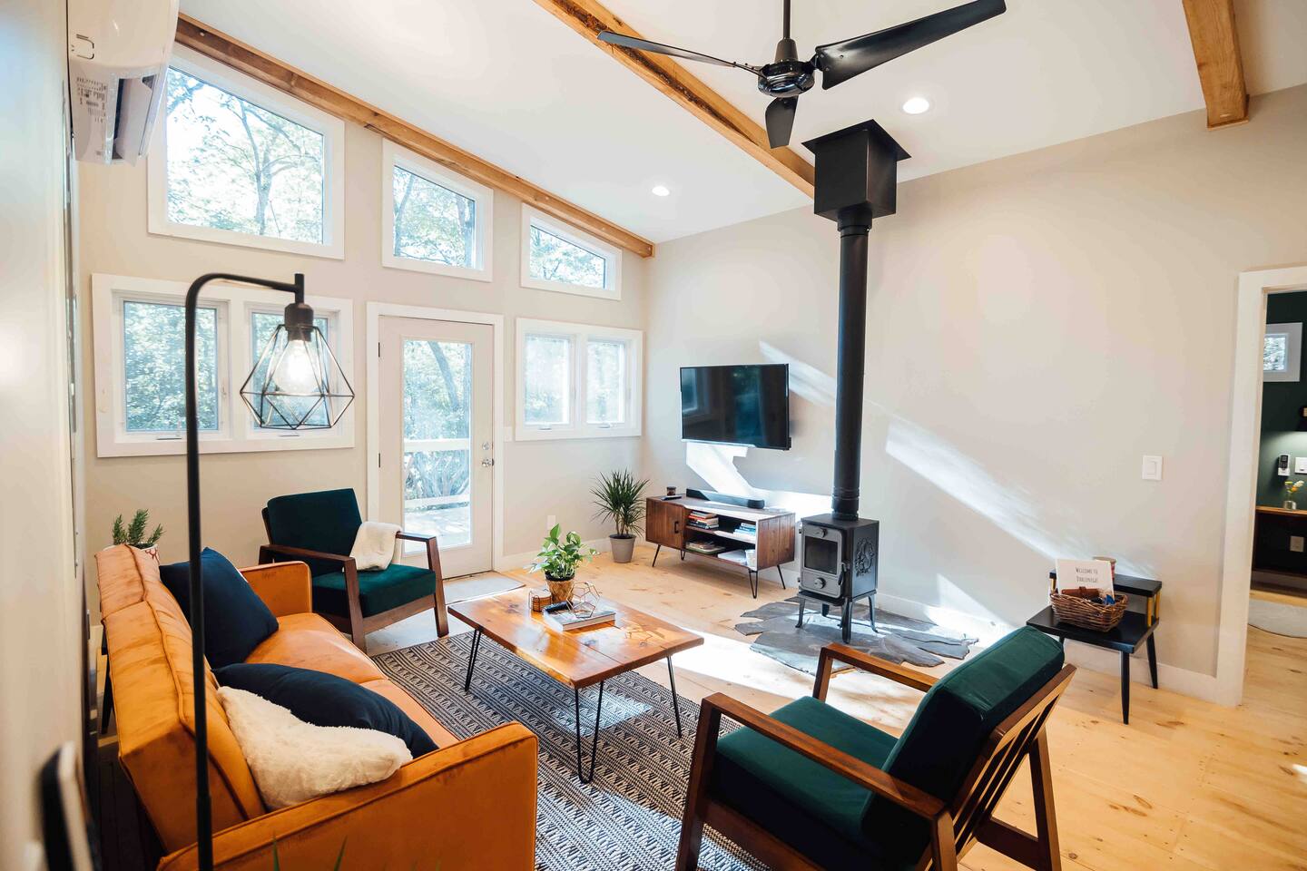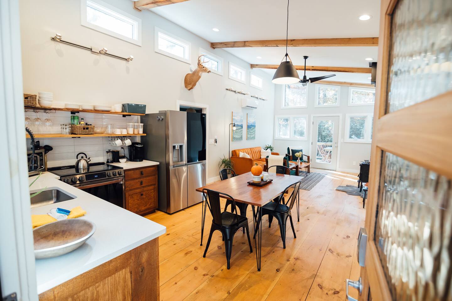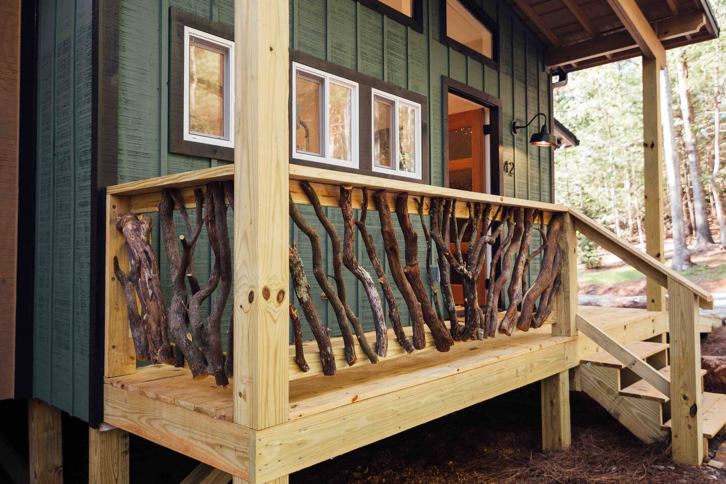 “Beautiful...comfortable...close to everything...spotless...perfect...peaceful” This is what recent guests have to say about their experience at Trahlyta. This new two-bedroom and two-bath modern cabin sits on 6 wooded acres just 10 minutes from town. The cabin is located at the end of a short paved driveway with easy access and plenty of parking. We are pet friendly and would love to host you and your pets during your trip to Dahlonega! Trahlyta Cabin was universally designed so that people of all abilities could have a beautiful, comfortable, and thoughtfully-designed space in which to experience the joy of travel. There is a ramp for wheelchair/limited mobility access. All interior doors are 36” wide. All appliances are ADA-compliant. All sinks are wheel-under. The kitchen table is wheel-under height as well. All doors have lever handles. The ADA bathroom is equipped with grab bars, a roll-in shower with a bench, and a handheld showerhead. Each bedroom features a queen-sized bed, its own mini-split AC/heat unit, and an en suite bathroom. Bathroom 1 features a wheelchair-accessible roll-in shower and grab bars in the shower and at the toilet. Bathroom 2 features a soaking tub and rainfall shower head and TUSHY bidet. Cause you're fancy like that. The living room is cozy, with a couch, chairs, a wood-burning stove, a TV with Roku, board games, a sound bar with Bluetooth connectivity, and even coloring books for the kids! Speaking of kiddos, we are happy to supply a pack-n-play and some toys/books - please let us know if you would like this accommodation. Dahlonega has some of the best dining in North Georgia, but sometimes you want something home-cooked. Cook a meal in our fully-stocked kitchen and gather around our dining table for four or take some plates outside to the patio dining set. The kitchen features stainless steel appliances and granite countertops, with complimentary 8-o'clock coffee and various tea offered to guests. We have a French press and a Keurig coffee maker. We have reusable K-cups or feel free to bring your own. Also, the fridge makes craft ice balls - perfect for an after-dinner cocktail. We have a charcoal grill located on the back deck- bring some charcoal and have a cookout! After a day of adventures, relax on the back deck which feels more like a tree fort, or around the fire pit. Enjoy the brand new outdoor tv area! Explore the woods! You might see some wildlife! You'll probably see Mama Deer and her fawn. We've also seen chipmunks, hawks, squirrels, and some guests are lucky enough to have seen black bears. Relax in the hammock on the back deck, but do so at your own risk! Whatever brings you to Dahlonega, we hope to provide you with a luxurious and comfortable experience at Trahlyta. **Cleaned and sanitized after each guest using CDC-recommended guidelines. We are committed to offering you a clean, safe place to vacation with friends or family.** Early check-in may be available for an additional fee of $35. STR License 4595