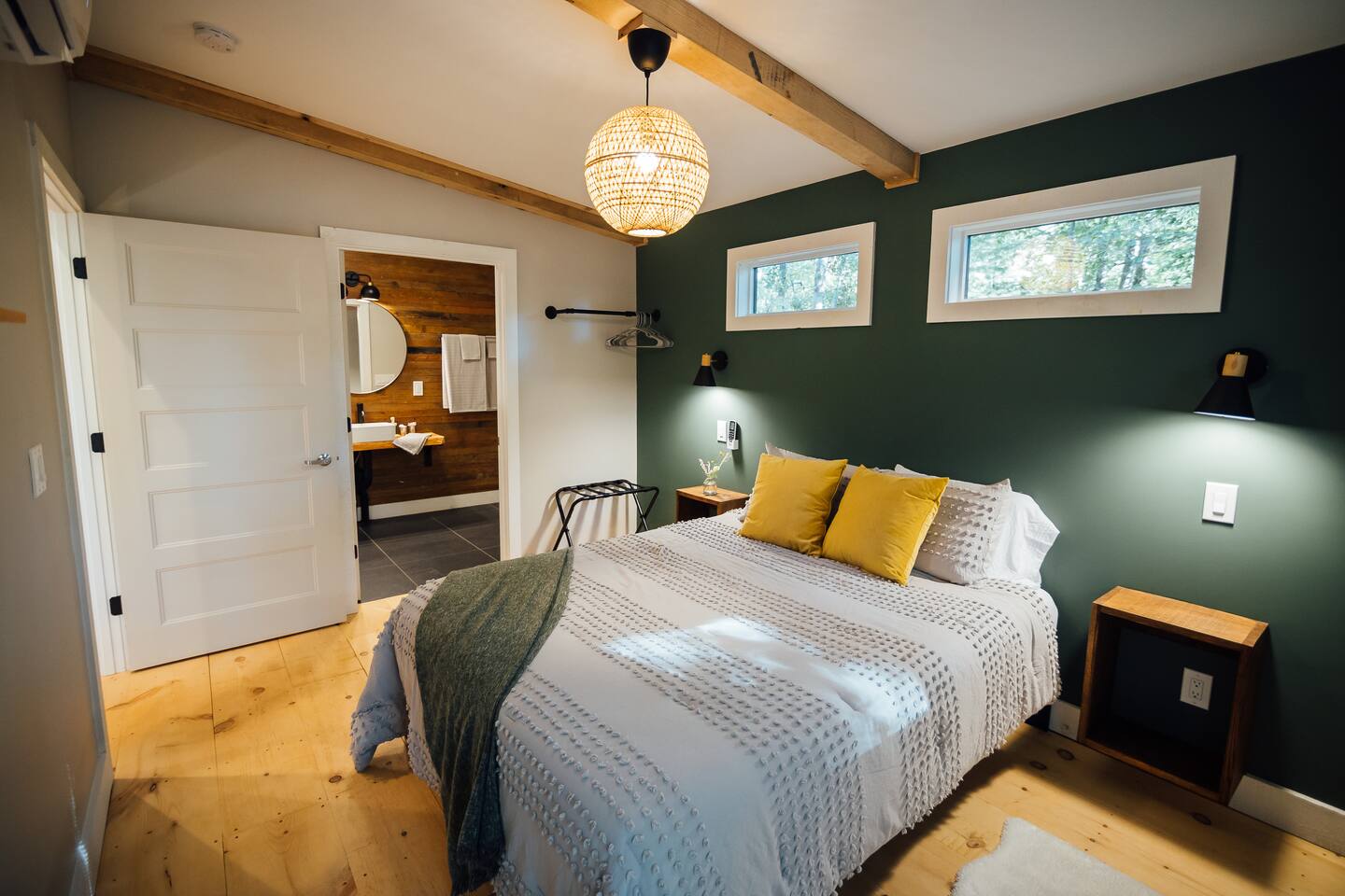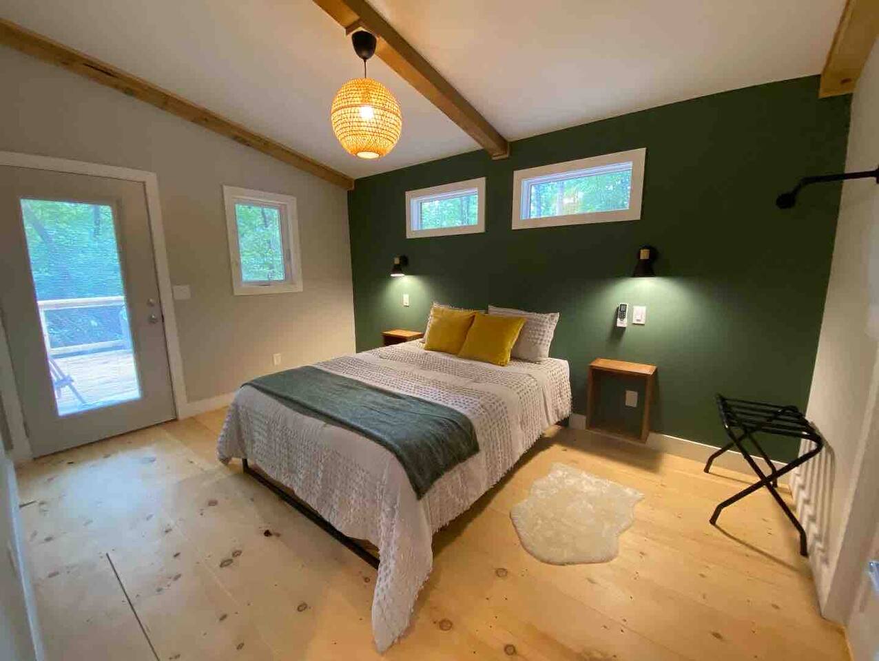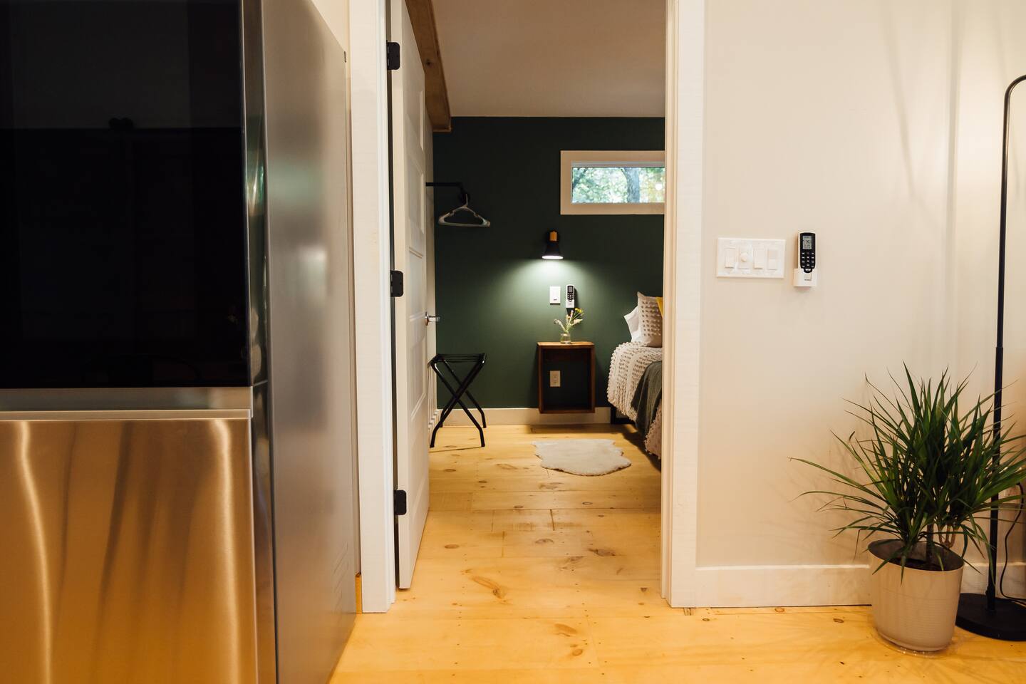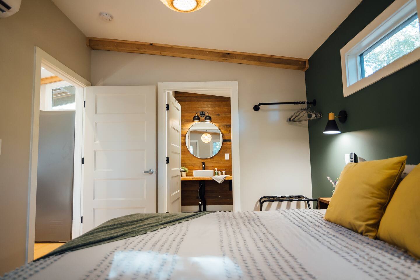 “Beautiful...comfortable...close to everything...spotless...perfect...peaceful” This is what recent guests have to say about their experience at Trahlyta. This new two-bedroom and two-bath modern cabin sits on 6 wooded acres just 10 minutes from town. The cabin is located at the end of a short paved driveway with easy access and plenty of parking. We are pet friendly and would love to host you and your pets during your trip to Dahlonega! Trahlyta Cabin was universally designed so that people of all abilities could have a beautiful, comfortable, and thoughtfully-designed space in which to experience the joy of travel. There is a ramp for wheelchair/limited mobility access. All interior doors are 36” wide. All appliances are ADA-compliant. All sinks are wheel-under. The kitchen table is wheel-under height as well. All doors have lever handles. The ADA bathroom is equipped with grab bars, a roll-in shower with a bench, and a handheld showerhead. Each bedroom features a queen-sized bed, its own mini-split AC/heat unit, and an en suite bathroom. Bathroom 1 features a wheelchair-accessible roll-in shower and grab bars in the shower and at the toilet. Bathroom 2 features a soaking tub and rainfall shower head and TUSHY bidet. Cause you're fancy like that. The living room is cozy, with a couch, chairs, a wood-burning stove, a TV with Roku, board games, a sound bar with Bluetooth connectivity, and even coloring books for the kids! Speaking of kiddos, we are happy to supply a pack-n-play and some toys/books - please let us know if you would like this accommodation. Dahlonega has some of the best dining in North Georgia, but sometimes you want something home-cooked. Cook a meal in our fully-stocked kitchen and gather around our dining table for four or take some plates outside to the patio dining set. The kitchen features stainless steel appliances and granite countertops, with complimentary 8-o'clock coffee and various tea offered to guests. We have a French press and a Keurig coffee maker. We have reusable K-cups or feel free to bring your own. Also, the fridge makes craft ice balls - perfect for an after-dinner cocktail. We have a charcoal grill located on the back deck- bring some charcoal and have a cookout! After a day of adventures, relax on the back deck which feels more like a tree fort, or around the fire pit. Enjoy the brand new outdoor tv area! Explore the woods! You might see some wildlife! You'll probably see Mama Deer and her fawn. We've also seen chipmunks, hawks, squirrels, and some guests are lucky enough to have seen black bears. Relax in the hammock on the back deck, but do so at your own risk! Whatever brings you to Dahlonega, we hope to provide you with a luxurious and comfortable experience at Trahlyta. **Cleaned and sanitized after each guest using CDC-recommended guidelines. We are committed to offering you a clean, safe place to vacation with friends or family.** Early check-in may be available for an additional fee of $35. STR License 4595