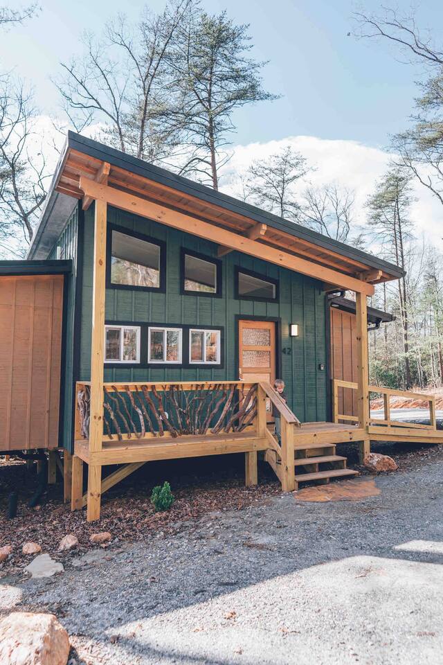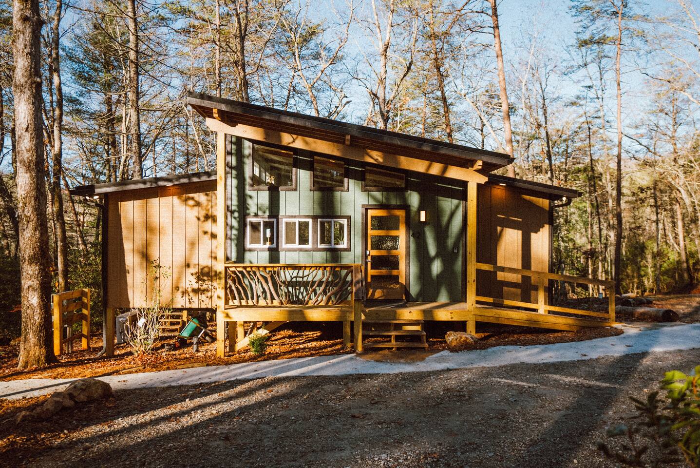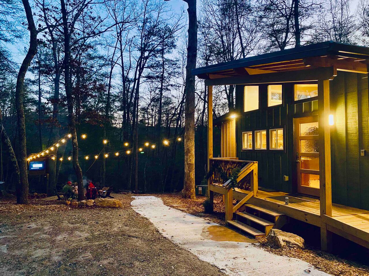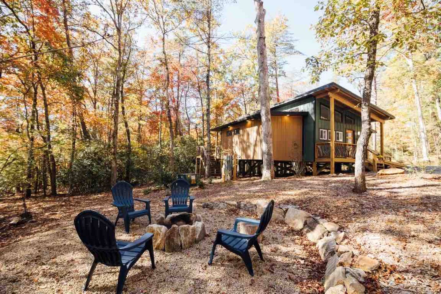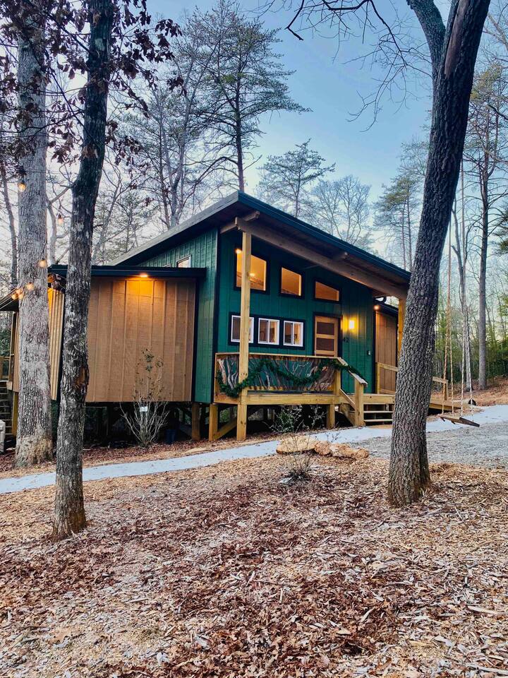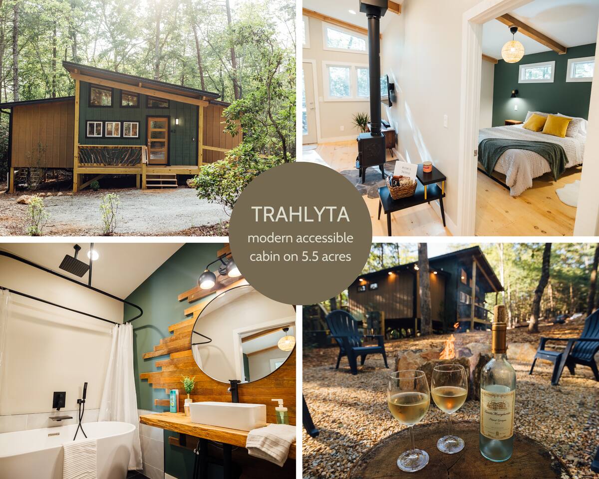 Trahlyta is a luxmodern cabin on 6 wooded acres in Dahlonega. It is adapted/wheelchair accessible ♿️ and pet-friendly. Your getaway awaits! Trahlyta is only... - 5-10 min from wedding/event venues -10 min from the historic square -10-15 min from wineries/breweries -10 minutes from the Appalachian Trail -1 mile from the 3/6 Gap Route 850 sq ft, 2 bedrooms, 2 bathrooms, an open living area, a stocked kitchen, and plenty of outdoor space- including outdoor tv/fire pit! Follow us @trahlyta_cabin